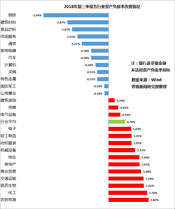 结构性调整大环境下,产能过剩行业去杠杆进程加快。钢铁及建筑材料板块为调整最快的两个行业,得益于业绩大幅改善的同时淘汰落后产能,两者资产负债率相较年初水平分别减少2.94%及1.87%,为全行业降杠杆之首,行业结构调整效果显著。而前三季度农林牧渔板块资产负债率相较去年年末上升幅度最大,增幅达1.82%。