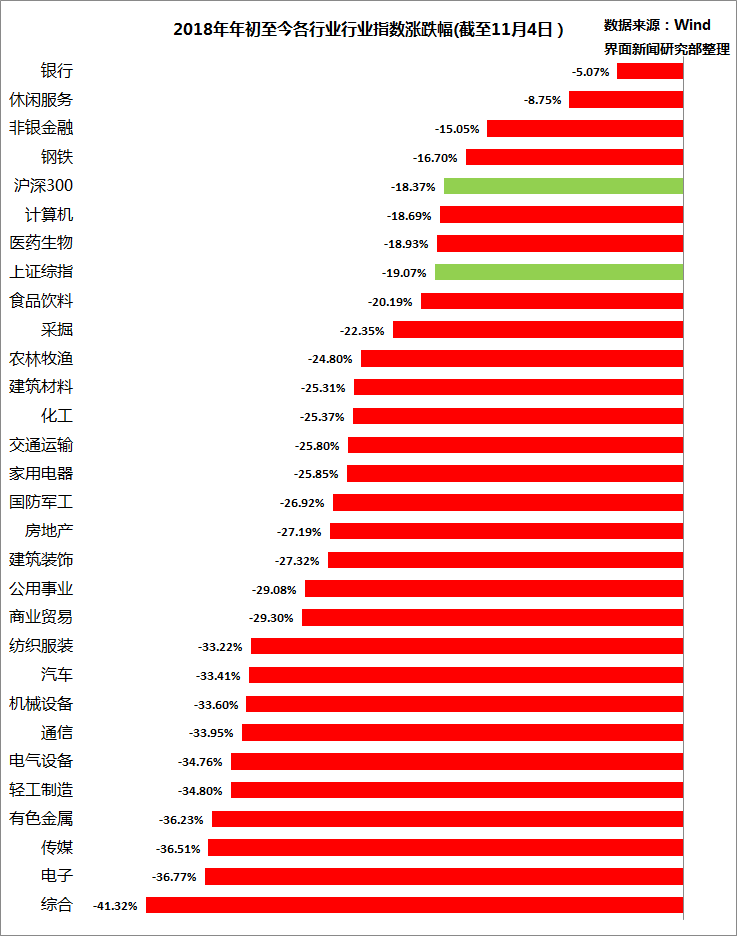 2018年年初至今,上证综指跌幅为19.07%,沪深300跌幅达18.37%,较中期跌幅加深。市场估值中枢下移幅度较大。28个板块中,各板块普跌,均呈现负收益,仅有4个行业跑赢沪深300。其中,银行业跌幅最浅,为-5.07%,另有休闲服务跌幅在10%以内。综合、电子、传媒、有色金属板块跌幅最深,跌幅均超35%,有10个行业年度跌幅超过3成。