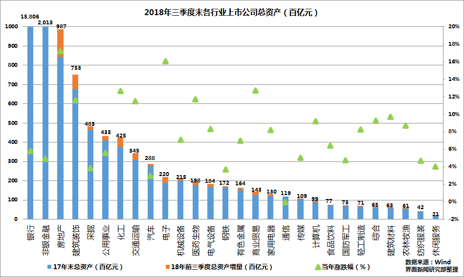 2018年三季度末全行业总资产为2,375,945亿元,较年年初上升6.69%。去掉金融行业后全行业总资产为594,056亿元,较去年年初上升9.67%,相较半年度同比增速提高3.94%。