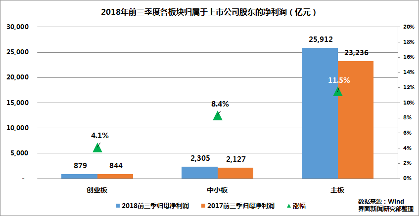 分交易板块来看,沪深两市主板实现归母净利润合计25,912亿元,中小板实现归母净利润2,305亿元,创业板实现归母净利润879亿元,净利润增速分别为11.5%、8.4%以及4.1%,盈利由主板公司带动。