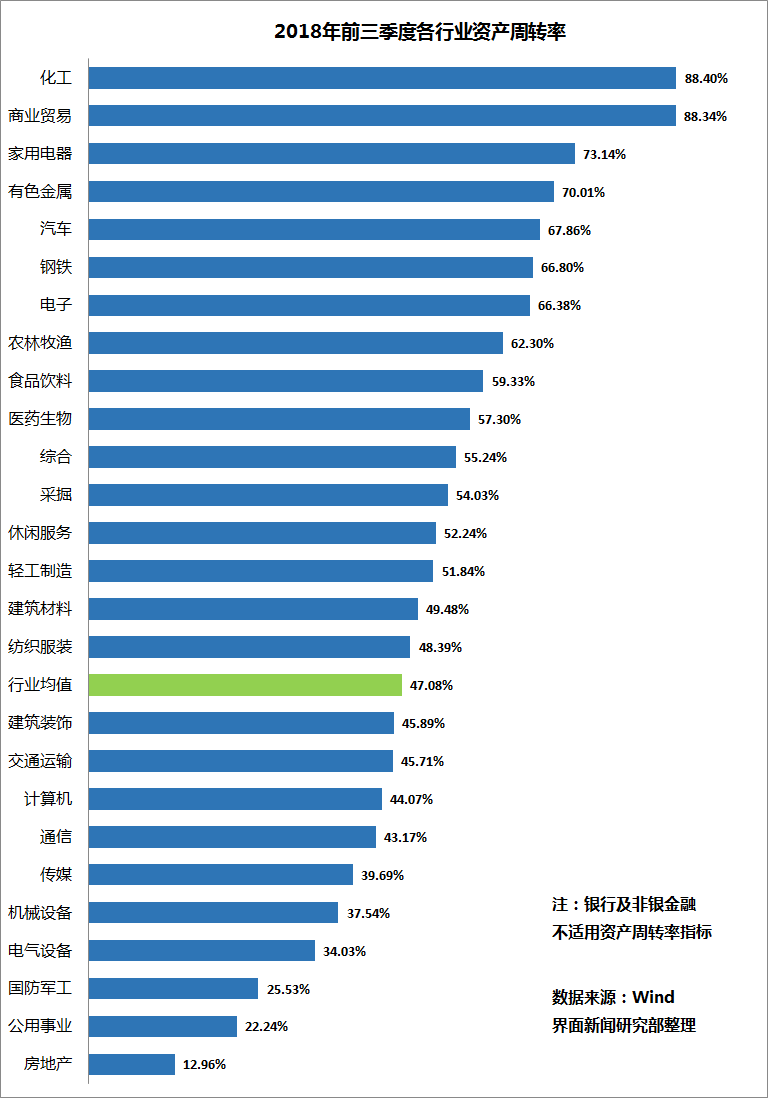 资产周转率体现经营期间全部资产从投入到产出的流转速度,反映企业全部资产的管理质量和利用效率。以三季度的口径计算,2018年前三季度,非金融业中化工业的资产周转率最高,为88.40%,最低为房地产企业,资产周转率为12.69%。剔除掉银行与非银金融板块后,全行业资产周转率为47.08%。