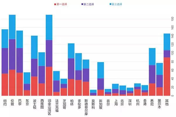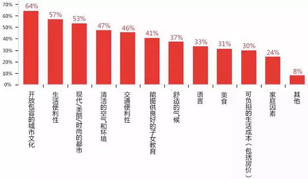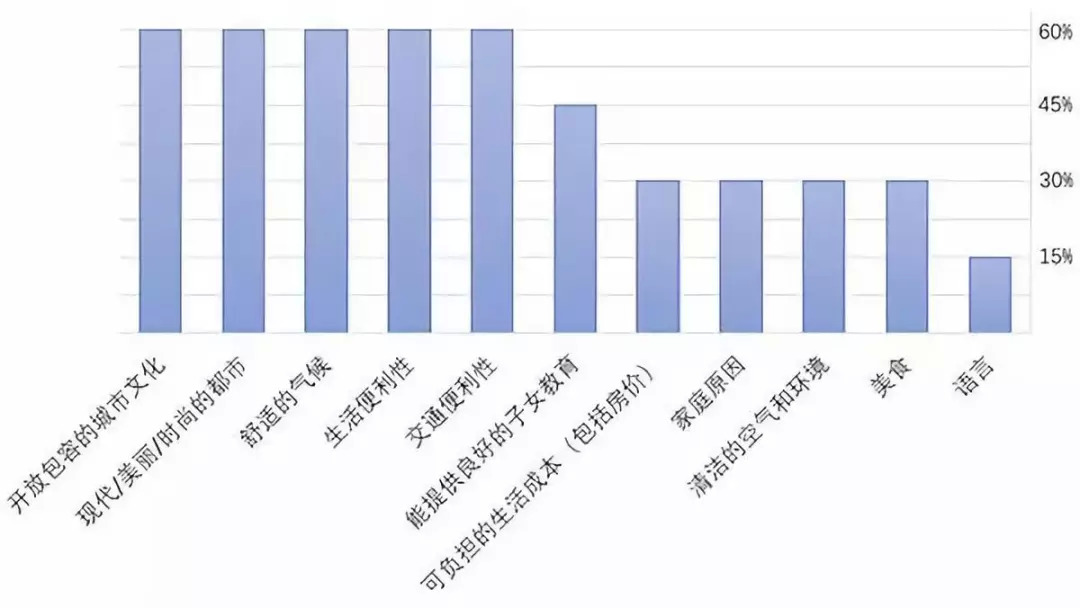选择人数较多的其他主要因素依次为日常生活方便、现代/美丽/时尚的都市风貌、清洁的空气和环境、便利的交通、能够提供理想的子女教育等。较为次要的考虑因素还包括城市的气候、语言、饮食和生活成本等。