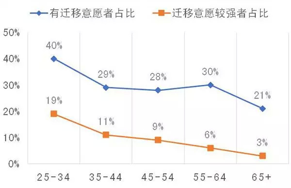 分年龄段调查结果显示,年轻科学家的跨地域流动倾向更强。在35岁以下年龄段的受调查者中,有40%表示在有合适机会的情况下有一定意愿来上海工作和生活,其中19%意愿较强。随着受调查科学家群体年龄递增,流动意愿逐渐减弱。35到44岁的科学家有11%有较强意愿来上海发展,45到54岁有9%,55岁到64岁只有6%。
