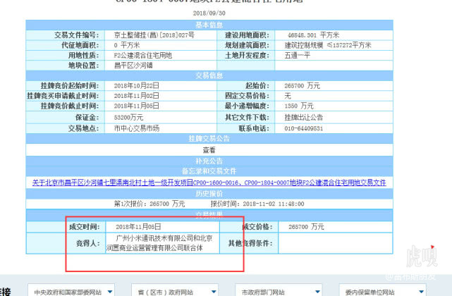 根据北京市规划和国土资源管理委员会官网披露,小米竞得北京市昌平区沙河镇七里渠南北村混合住宅用地46848.301平方米,最终竞购价与起始价26.57亿元一致。