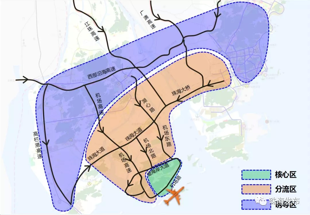 为核心区外围西部沿海高速以南的区域。涵盖道路包括:机场路、机场北路、机场西路、机场高速、珠海大道、滨湖路、金海岸大道、鱼林路、琴石路、安基路、湖心路、珠峰大道等道路。分流区将有序调控管制交通流。