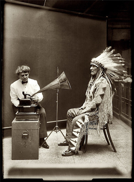1916年,民族音乐学家Frances Densmore在美国民族学办公室为黑脚族首领山酋长(Mountain Chief)录音。