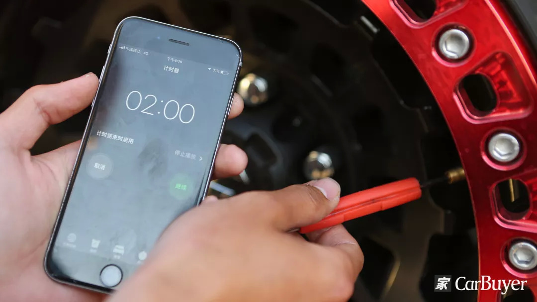 由于同类别放气产品效率都不会差太多,此次我们尝试仅将气门芯拧松进行测试。倒计时两分钟后胎压仍高达2.8bar,几乎等同于无效。