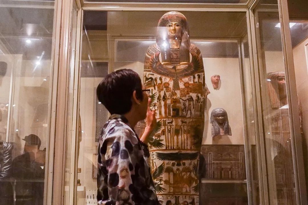在古埃及展馆内,志愿者指着一具法老棺木告诉我们,这是世界上第一个在研究中被做过全身 CT 检查的木乃伊,其死因是牙龈感染。为了保护里面完好的木乃伊,博物馆决定永不开棺。