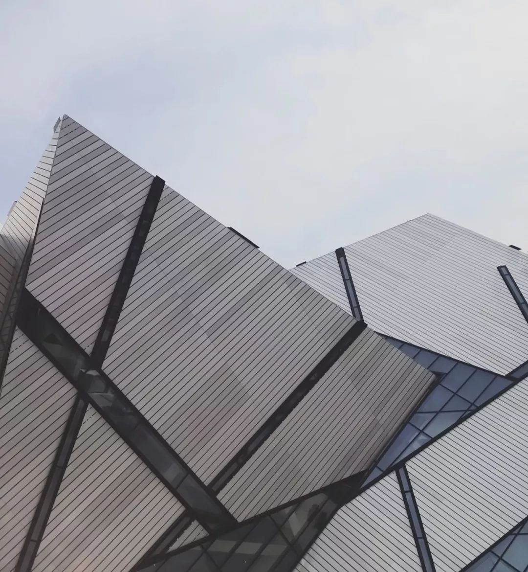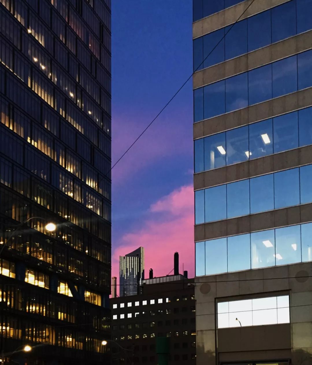 在多伦多的最后一晚,我临时决定出去走走,并坚信会在这个晚上发现点什么。当时正是晚上七点半,我背对着夕阳的方向散步,试图通过放空自己洗去出差的疲惫,但许久的散心都未及回眸时的惊喜——在两栋大楼间露出了一线紫色的晚霞: