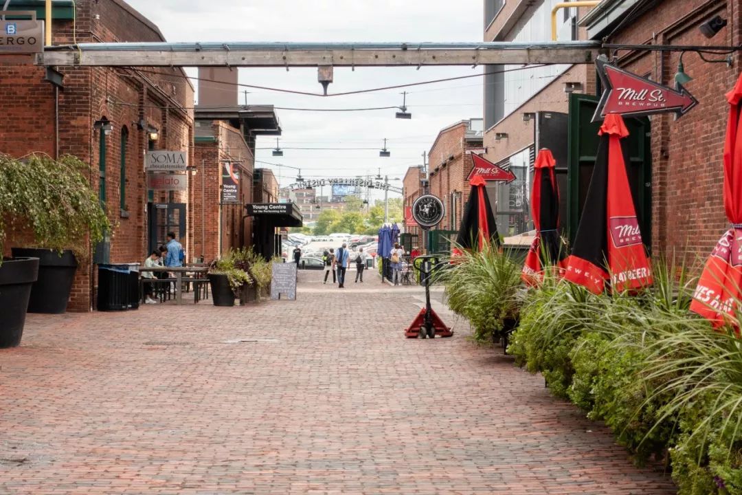 这里曾是19 世纪的最大的酿酒厂之一“The Gooderham and Worts”的所在地。随着酿酒厂在 20 世纪末的关闭,这里逐渐走向衰落。1998 年,这里被设为加拿大国家遗址。2001 年,Cityscape Holdings 公司购买了这片区域,他们用 19 世纪的建筑材料对这里进行了修复,改造为了如今遍布餐厅、酒吧和精品店的步行区。