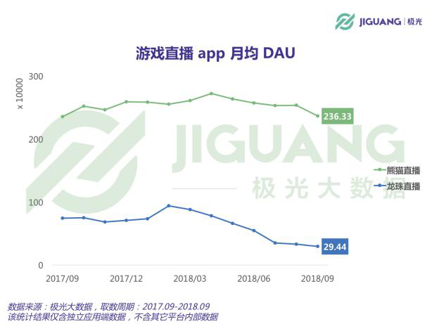 但是好景并没有持续多久,因为此时的斗鱼、虎牙已经占据绝大多数观众,龙珠自家培养的顶级主播纷纷跳槽也接连发生。从2017年至2018年,LOL一哥“隔壁老王”、“CF第一主播”陈子豪、DNF头号主播旭旭宝宝、还有最后出走的德云色,都选择了企鹅或斗鱼更大的平台。这些大主播的离去让龙珠流失了很多粉丝,甚至还有粉丝为给自己的主播抱不平,给龙珠直播APP刷出了一星的评价。从极光大数据显示的资料来分析,2017年至今,因为主播出走、多元化发展造成龙珠的月均DAU和APP渗透率逐月下滑,整体规模更被晚辈熊猫直播远远超过。更有坊间传闻,苏宁有可能放弃龙珠不再做相应投入。