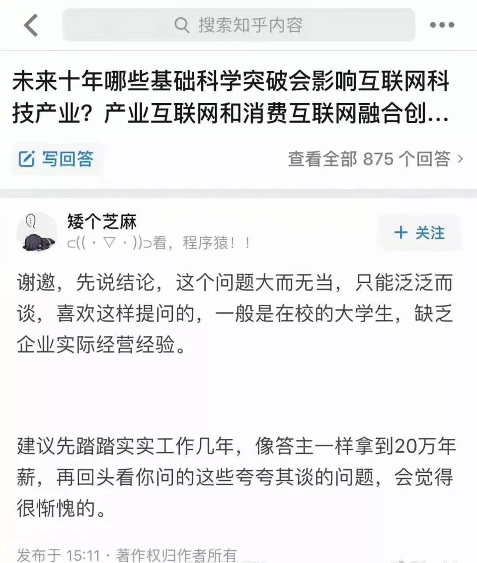 知友@矮个芝麻假装不识ponyma,凭借段子式回答“建议先踏踏实实工作几年,像答主一样拿到20万年薪,再回头看你问的这些夸夸其谈的问题,会觉得很惭愧的”,赢得近10万点赞,在众多答案中脱颖而出。