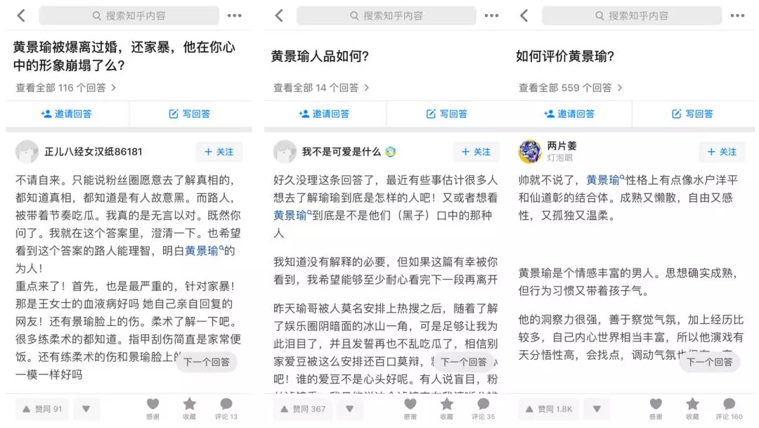 近日,演员黄景瑜被曝家暴前女友王雨馨,登陆微博热搜。知乎关于此事的提问也迅速跟进,其中“黄景瑜被爆离过婚,还家暴,他在你心中的形象崩塌了么?”的问题下,热门答案就由粉丝贡献。