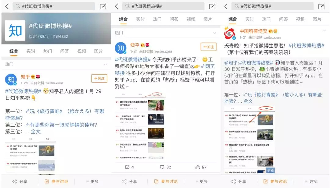 微博热搜暂停期,也正是知乎的产品调整期。知乎在站内增添了热榜页面,还上线了知乎热榜小程序。不久,#代班微博热搜#的话题经由各路大V热捧,迅速吸引路人关注。