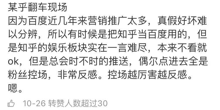 如今,@矮个芝麻的回答已被知乎官方折叠,但将此形容成“翻车现场”的评论仍此起彼伏。大量知友痛心疾首平台专业性、讨论氛围早不复往日。显然,站在我们面前的,已不再是小众的都市高知·知乎,而是大众的八卦段子·娱乎。