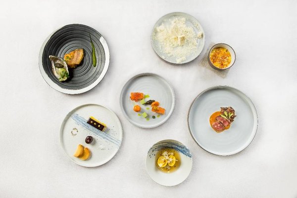 此次华尔道夫创意宫廷法餐菜单共含七道菜肴。开胃小食翡翠呈祥以慈禧太后生平喜爱的“翡翠豆腐”为灵感,选取当季新鲜的三文鱼为“翡”,嫩毛豆泥为“翠”。前菜一品骛宝将乾隆皇帝钟爱的鸭肝用法餐的烹饪手法呈现,以北方喜食的馒头经烤制替换法餐常用的面包。菜单中的汤品使用葛仙米、布列塔尼蓝龙虾、花胶及冬瓜四种食材;曾是朝廷贡品的葛仙米,营养丰富产量稀少,是珍贵的药食水生藻类。两款主菜分别是金鱼戏莲和福禄双至。金鱼戏莲采用应季的喜知次鱼,搭配法国蓝口贝和烟熏安之莲生蚝。福禄双至以曾是宫廷赏赐之物的鹿肉和鹿筋烹制而成,在现代餐桌上已难得一见。最后两款甜品,五福满堂是一款加入了五粮液提味的焦糖布丁,而华芝如意则是一道芝士甜品,通过液氮营造出雾气缭绕的意境。