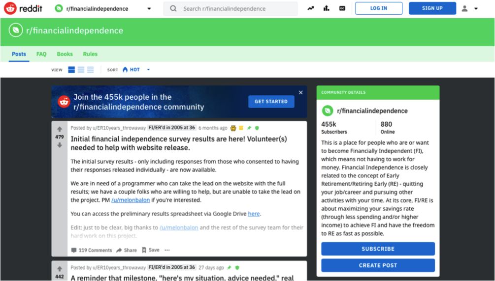 原以为只是千禧一代年轻人打出的口号,但当打开社交网站Reddit的FIRE活动页后,才发现这次运动是有组织、有计划、有愿景的。它呼吁拒绝高消费,注重性价比,缩减一切不必要的支出;开源节流,除了减少开支以外,鼓励年轻人通过各种合理的方式增加收入,比如提升教育背景,请求升职加薪,寻找副业等,虽不能帮你走上人生巅峰,但不失为增加收入的好办法;强调年轻人应该树立投资理财的观念,注重长期的投资回报率,让你的钱为你创造更多的价值。