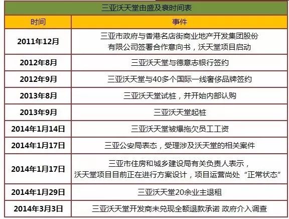 但一切并不是投资客想象得那么简单,“沃天堂”项目的进展像蜗牛爬行一般缓慢。2014年1月14日,随着三亚“沃天堂”拖欠员工工资而被曝出内幕。3天后,三亚“沃天堂”开发商香港名店街公司在内地多个项目搁浅的消息也被曝出。危机一触即发,“沃天堂”项目神话,开始走向破灭。