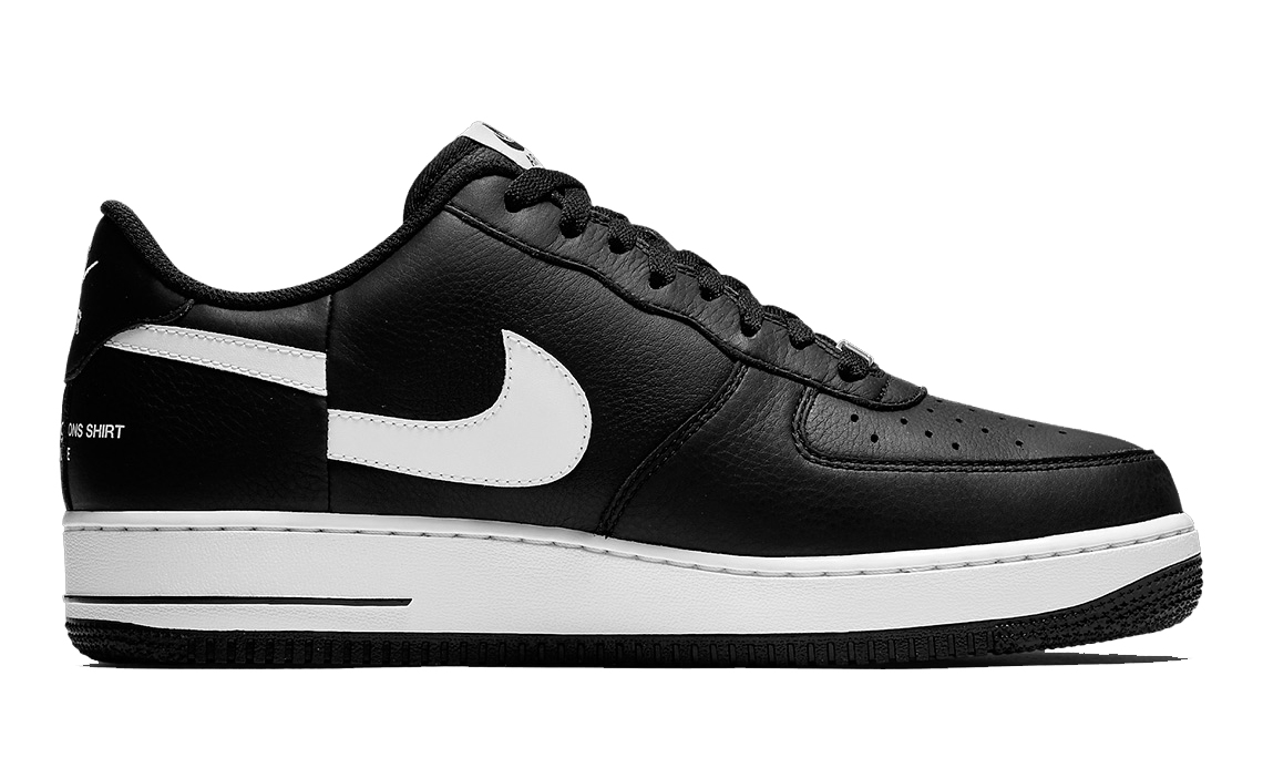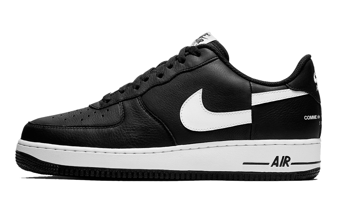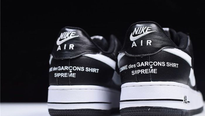 与Supreme x CdG SHIRT x Nike Air Force 1 Low的纯白主打搭配印染图案不同,这款联名沿袭了常见的 Air Force 的黑白配色风格;Swoosh部分的错位在今年Supreme x CdG SHIRT的联名后再次使用;后跟处的三方Logo十分显眼,亦是这款是的主打卖点。