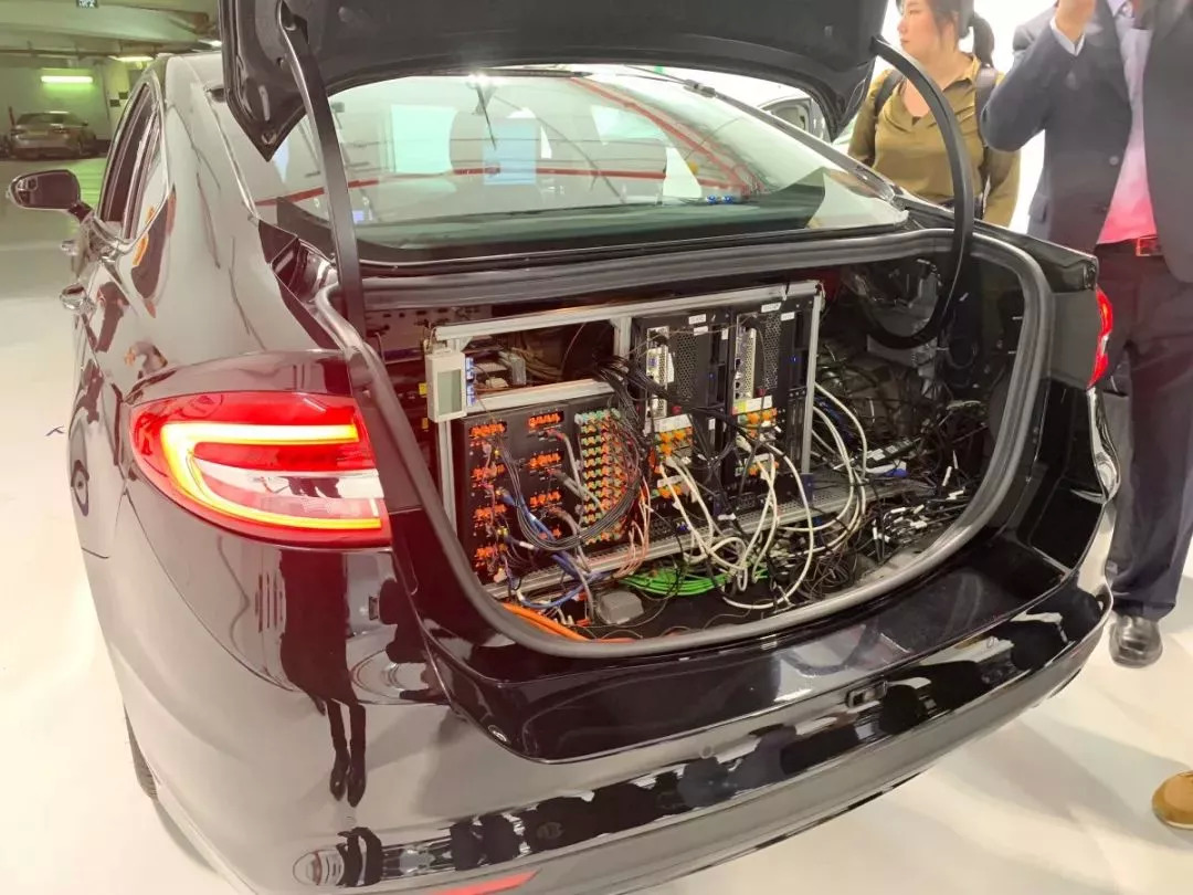 在车尾后备箱,我们可以看到两台尺寸较大的主机与一台“Mobileye大脑”,两台主机主要进行数据的处理与采集,“Mobileye大脑”与12个摄像头连接进行全局控制。