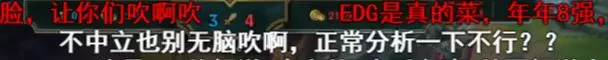 甚至到后来连观众都看出 EDG 的形势并不乐观,比如人头数领先经济却和对面持平,这是一个非常危险的信号,但是解说却依旧带着很强的偏向性去解说这场比赛,觉得 EDG 不会输。