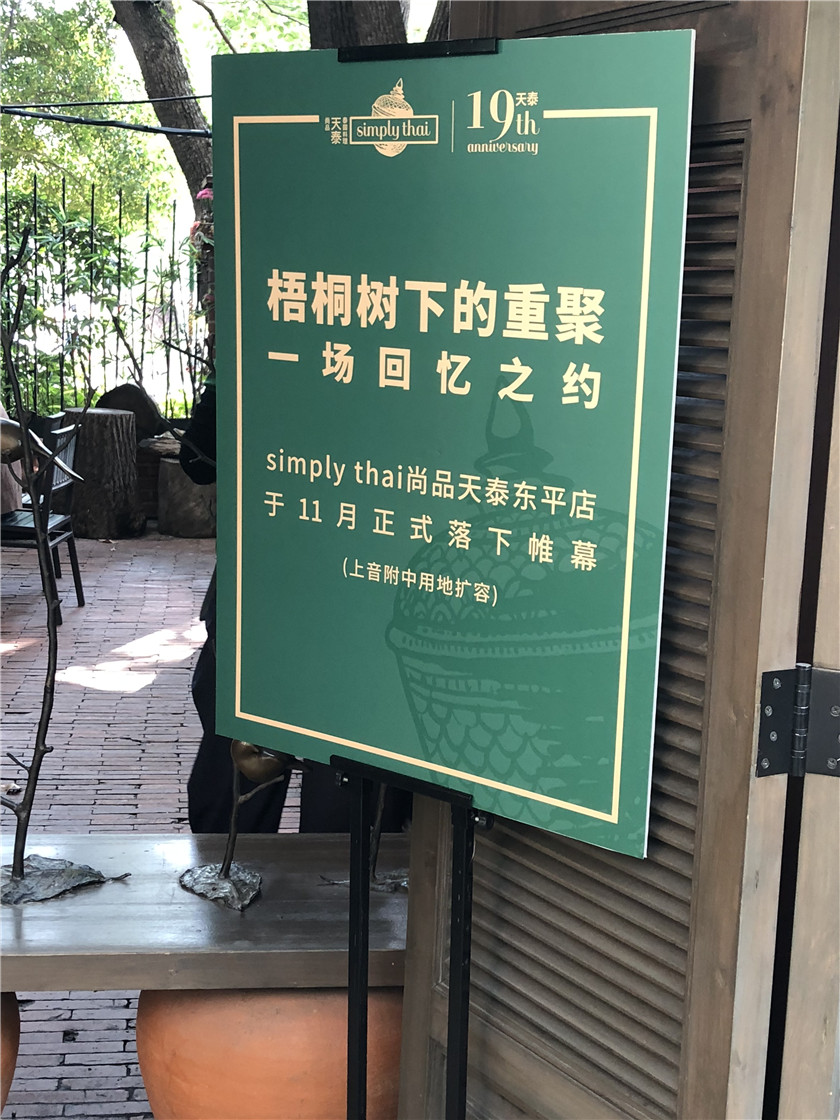 东平路店是天泰在上海开设的第一家店,1999年开门迎客,今年正是第19个年头。在店铺几个月前立起的歇店告示上就能看到“19th”的字样,只是不太起眼。更吸引眼球的是“simply thai尚品天泰东平店于11月正式落下帷幕(上音附中用地扩容)”的通知。