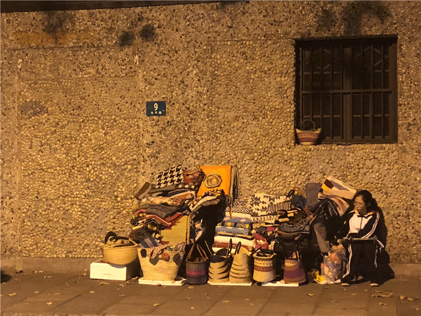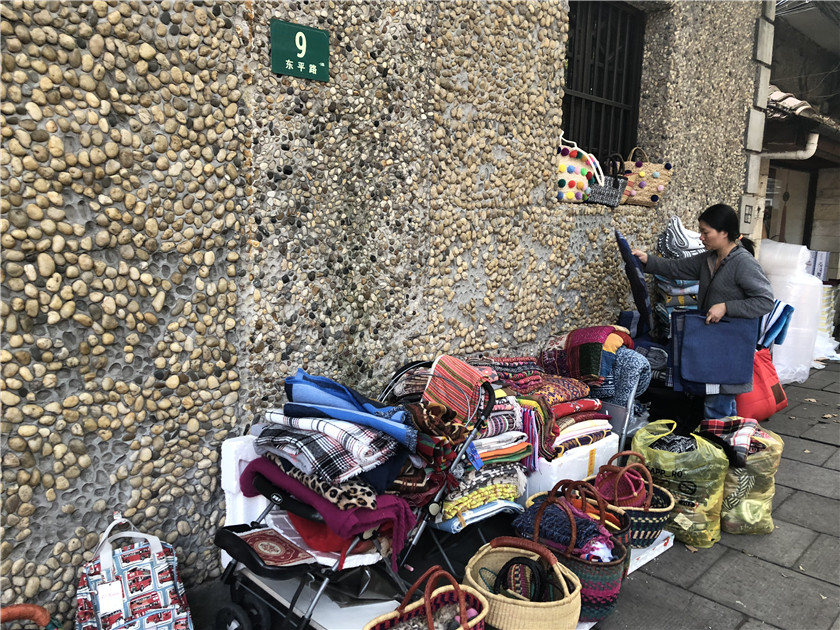 “都没什么人的,有也就是买个一件两件的围巾。”在青珑工坊店外头摆地摊的周阿姨对于这两年东平路的客流量也颇有发言权。从2013年起,周阿姨开始在离自己租住地不远的东平路一带摆地摊。考虑到常来这里的多是外国人和时髦年轻人,她颇为精明地将销售的品类定为“非洲的篮子”、“欧洲的围巾毯子”,早几年生意一度称得上“红火”。