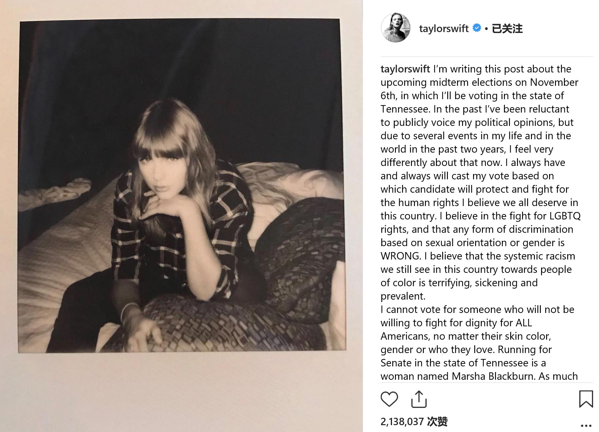 10月初,即将年满29岁的美国歌手泰勒·斯威夫特(Taylor Swift)在社交平台Instagram上公开谈起政治,决定支持两位民主党候选人进入国会,并且还特别呼吁年轻选民一起考量候选人的价值观,并参加投票:
