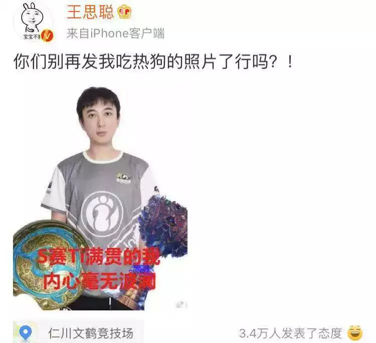 IG获得了S8总决赛的冠军,王思聪也到现场督战了。王校长吃热狗的照片传到网上,一下子成为新晋头像和表情包。王思聪还发了微博说:“能不能不要发我吃热狗的照片了。”