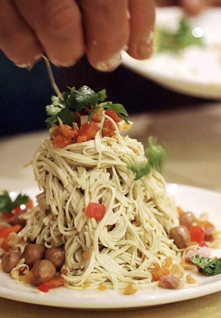 切好的干丝烫熟好后捞出来,撒上生姜丝、香菜、虾米、肴肉、花生米等,再淋上一些酱油、麻油。饱满味觉的烫干丝经过层层制作,最好的美味总是值得期待的!