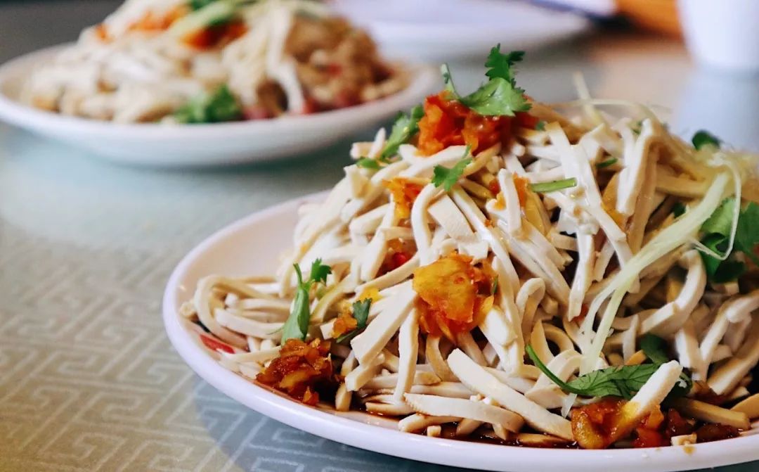 一碟厚实的干丝小山,把干丝在盘子里铺成厚厚一层均匀充分的吸收酱汁,不一会就见底啦!