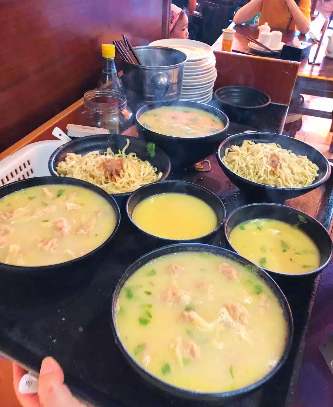 阿姨会先排好一排排的大花碗,各种独家配料一一倒入,等待出锅。等到锅里的面条煮熟后,再一一用漏勺放入碗中,大家蜂拥而上认准自己的那一碗面,呼噜呼噜就开始吃不停了。