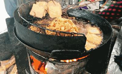 这是一家没有名字也没有招牌的摊子,但是吃过的人都叫它老东站臭干。用的是柴火来炸臭干,锅里沸腾的油冒着泡,慢慢变成金黄色的臭干,捞起在小铁丝篓子里量一量,过滤掉油,就可以装袋给食客了。