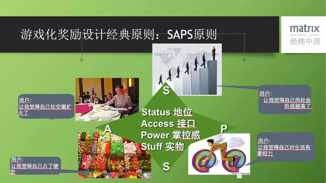 游戏化奖励设计中还有一个经典原则:SAPS分级等级机制—— Status(地位)、Access(接口)、Power(掌控感)、Stuff(实物)。