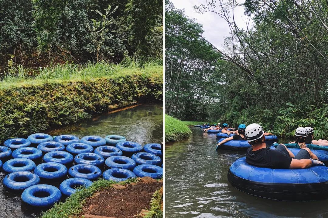 可爱岛与热闹的欧胡岛毗邻,乘坐夏威夷航空从火奴鲁鲁机场出发,约半小时即可抵达。次日清晨,我们体验了此行的第一个项目——山涧漂流之旅(Mountain Tubing Tour)。这里曾是一家生产蔗糖的工厂,这条漂流路线也是工人用做运输甘蔗的水道,后来被开发成了山涧漂流项目。