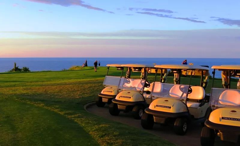 从傍晚日落开始,你可以自己开着高尔夫球车,从这个18 洞高尔夫球场逛上一圈,一路都是满眼葱郁和太平洋美景,非常震撼。