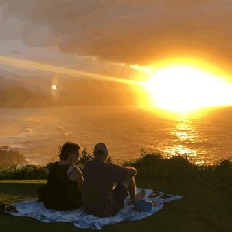 旅程最后,会在球场悬崖海岸边,邂逅一场摄人心魄的日落。在可爱岛几乎每天都会出现极美的日落,无论是游客还是本地人,都会被那橘红色的太阳沉入大海的景象打动。在看日落的地方,遇到一对相依看日落的老夫妻,如此浪漫场景仿佛只有在电影里才会出现。