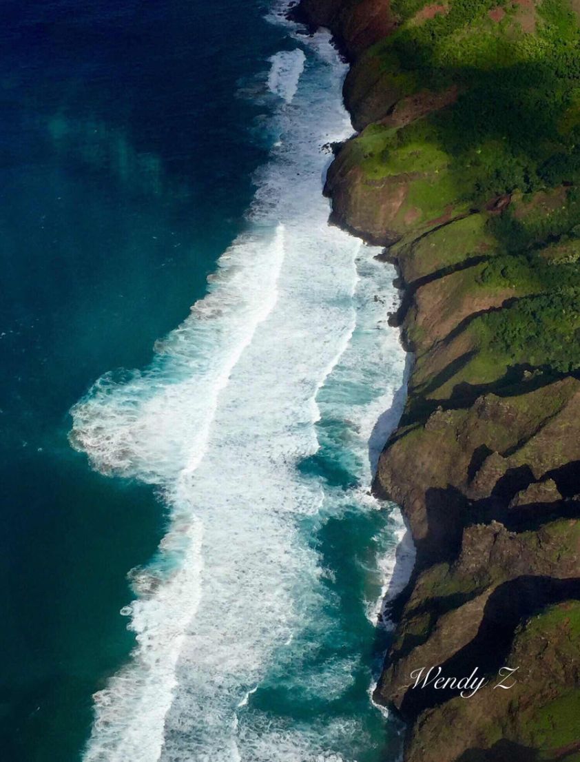 整个行程在50分钟左右,每一分钟甚至每一秒收进眼底的都是令人屏住呼吸的青翠壮丽,时而掠过山尖,时而下探至威美亚峡谷腹地,时而飞过纳帕利海岸的海喷泉上空。