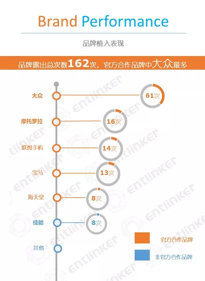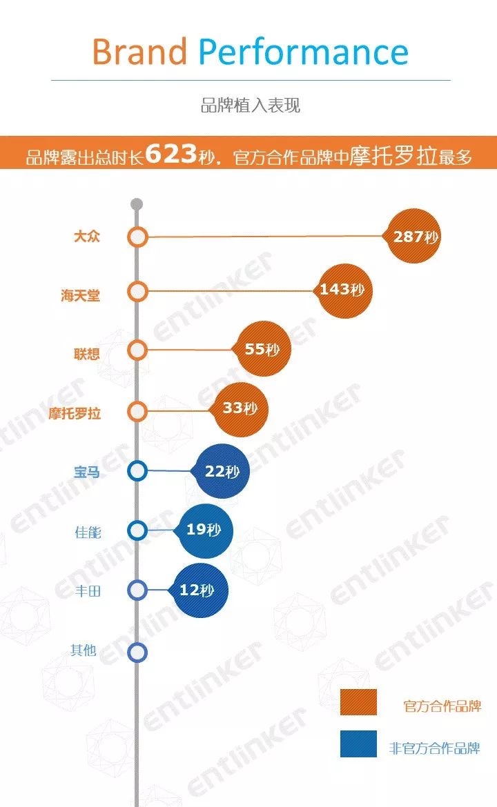 要说品牌植入,全片共露出17个品牌,其中官方合作品牌仅有4个——两个手机品牌联想和摩托罗拉以及大众汽车、海天堂。从植入时长和频次的表现来看,4个官方品牌的植入表现都远高于影片平均水平,植入权益还是得到了保证的。