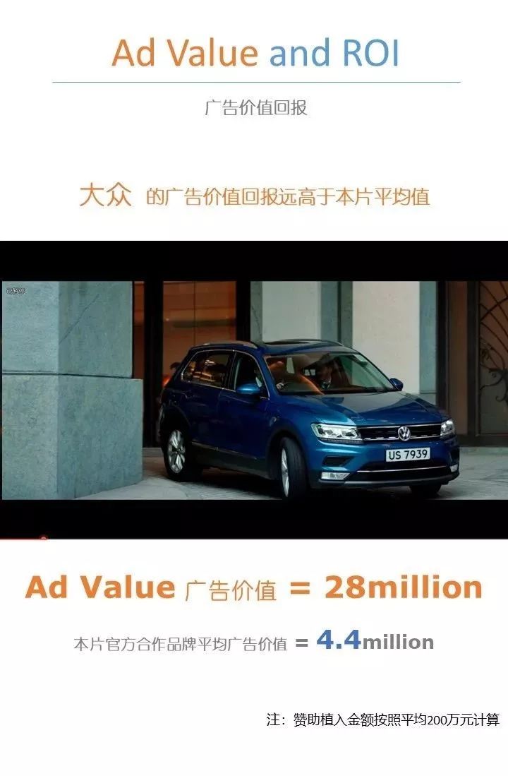 综合品牌露出表现、影片票房等数据,大众的广告价值回报是最高的,且是官方合作品牌平均广告价值的近7倍。