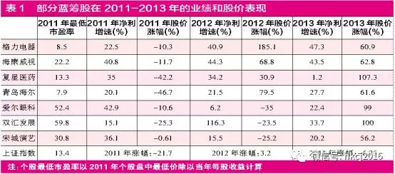 笔者梳理了一些蓝筹股在上一轮熊市里的表现(见表1、图1),市盈率处于历史低位且业绩保持强劲增长势头的公司,如格力电器、海康威视、复星医药、青岛海尔,股价在2011年末就率先筑底反弹,此后走出独立上涨行情;而在2011年估值偏高的公司如爱尔眼科、双汇发展,以及估值适中但业绩增速逐渐下滑的公司如宋城演艺,其股价则继续和熊市一起低迷,直到股价足够便宜、业绩企稳后才开始反弹。