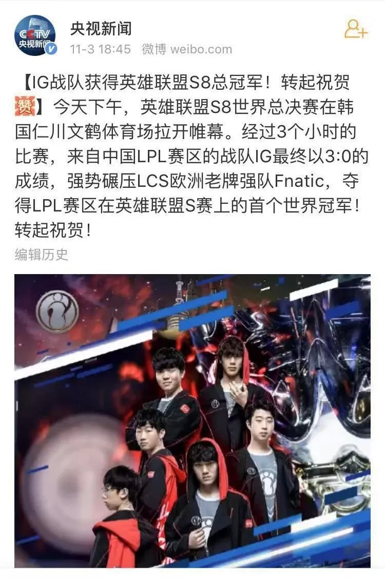 11月3日,由“国民老公”王思聪挂帅的IG战队在韩国击败了欧洲老牌战队Fnatic,获得了LPL赛区在英雄联盟S赛上的首个世界冠军。