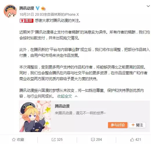 为了及时止损,各大漫画平台纷纷选择了暂停孵化,许多漫画平台开始调整预算,暂缓支付作者稿酬。其中最显眼的,大约就是陷入“停止支付稿酬”风波的腾讯动漫了。