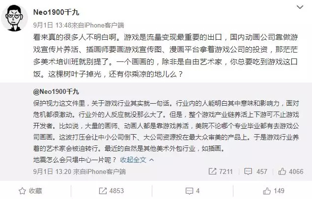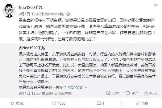 他说:“看来真的很多人不明白啊。游戏是流量变现最重要的出口,国内动画公司靠做游戏宣传片养活、插画师要画游戏宣传图、漫画平台拿着游戏公司的投资,那茫茫多美术培训班就别提了。一个画画的,除非是自由艺术家,你总要吃到游戏这口饭。这棵树叶子掉光,还有你乘凉的地儿么?”