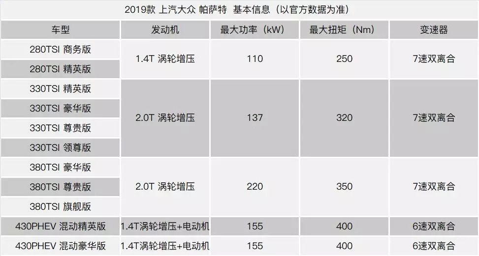 相信大众品牌的动力系统大家已经非常熟悉了,2019款帕萨特传统燃油车型的动力系统自然不会给大家带来什么惊喜。1.4T的车型采用的是EA211发动机,而2.0T的车型则采用的是第三代EA888发动机,并被分为了高、低两种功率版本可供选择。至于插电混动版,它采用了一套由1.4T发动机、电动机和三元锂电池组构成的插电式混动系统,传动系统匹配DQ400e型6速双离合变速箱。其纯电行驶63公里,0-100km/h加速时间为7.8秒,工信部综合油耗1.4L/100km。