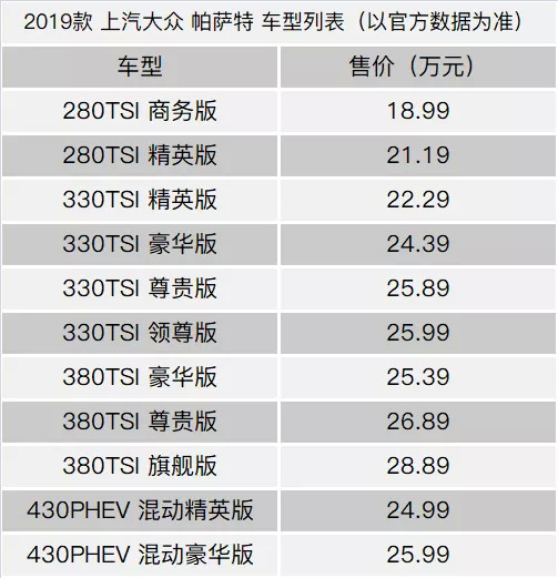 先来看汽油版本的8款车型:入门的商务版只有1.4T一款车型,它是全系唯一20万以下的车型,虽然在配置方面不算完善,但大家最在乎的LED前大灯、无钥匙进入/启动、天窗等时髦的配置都有,推荐预算有限的朋友购买;之后是精英版,它拥有1.4T和2.0T低功率两款车型,它们配置合理,价格适中,在全系车型中性价比表现突出,值得推荐;再往上是豪华版和尊贵版,都提供2.0T高、低功率车型,在配置方面较精英版更上一层楼,推荐准备购买2.0T高功率版本车型的朋友选择;领尊版是2.0T低功率版本独有车型,价格和尊贵版相当,只是配置取向稍有差别,可按需选择;最后是顶配的旗舰版,配置方面自然不必担心,价格与同级车型的旗舰车型相比也很有诚意,只是问问君认为如果有这预算完全可以去看看辉昂,毕竟它才是上汽大众真正的旗舰。至于两款混动车型,经过前面的对比,显然是购买高配的混动豪华版更为明智。
