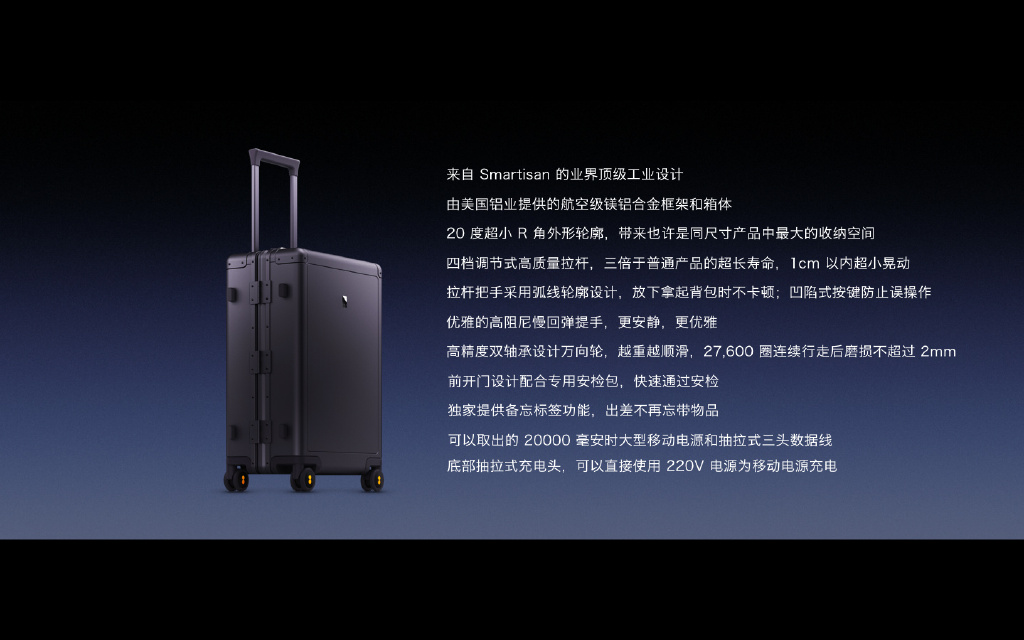 旅行箱主打的卖点除了锤子科技的工业设计以外,地平线8号旅行箱还拥有一个20000毫安时大容量18W快充移动电源;内置1米长抽拉数据线,自动复位,随时悬停;同时提供MicroUSB、USB-C 和 Lightning三种接口;移动电源可轻松插拔,快速过安检。