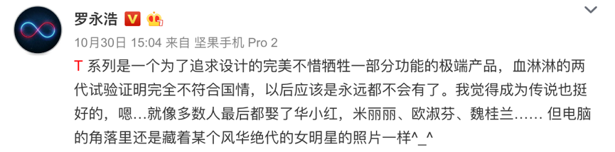 成都办公室到底发生了什么,锤子科技是不是存在巨大的资金问题等都还未得到答案时,两周后,罗永浩在微博上公开表示未来锤子科技不会再生产T系列手机,并把这个原因归于特殊的“中国国情”。