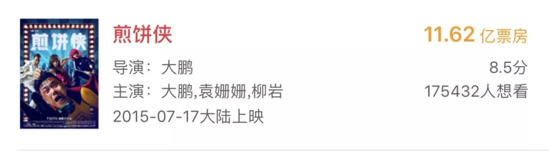 故此,在《煎饼侠》缺投资的前提下,大鹏找到张朝阳,而张朝阳基于对他在搜狐的信任,直接给与了2000万的投资,并还在其中客串助力了一把。最终,《煎饼侠》融到了来自大鹏、新丽传媒、万达影视、金狐传播(搜狐旗下公司)共五千万的资金。