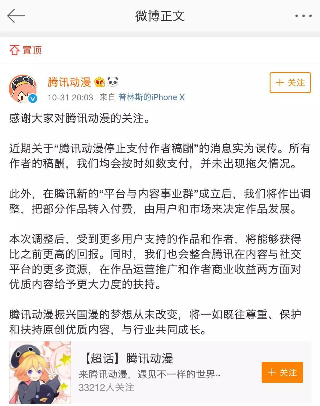 10月31日晚8点,针对此前广为流传的“腾讯动漫因预算问题暂停支付部分签约作品稿费”的言论,腾讯动漫官方微博发布正式公告进行澄清,表示所有作者的稿酬均会按时如数支付,并未出现拖欠情况,并且腾讯动漫将在“平台与内容事业群”成立将作出调整,把部分作品转入付费,由用户和市场来决定作品发展。